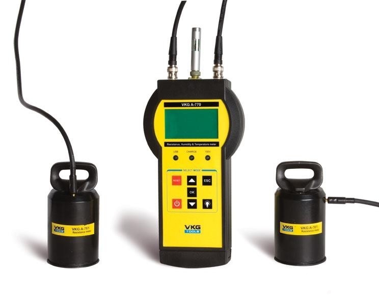 Прибор измерения поверхностного сопротивления покрытий, влажности воздуха и температуры VKG A-770 совмещает три измерительных прибора: гигаомметр, гигрометр и термометр.